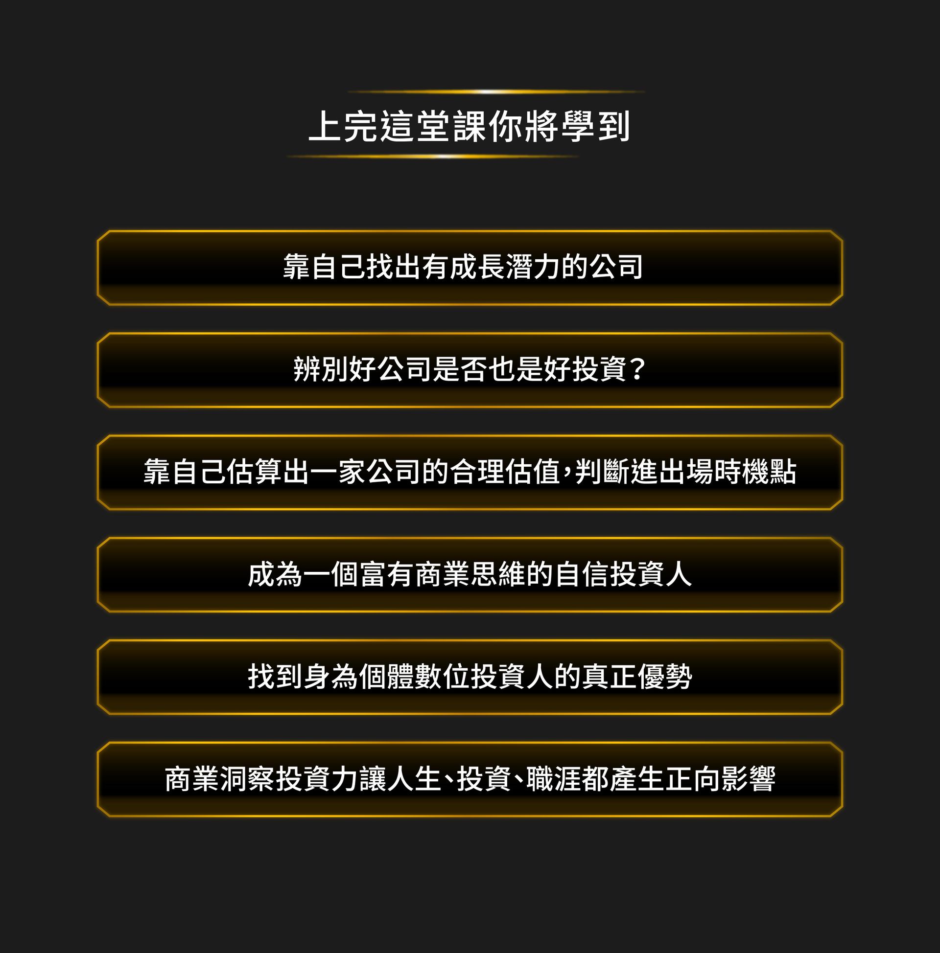 相較市場上常見的「透過落後的數字結果來篩選公司」,本堂課的「商業洞察法」之所以如此迷人且有用,是因為他讓我們立於制高點,透過真實的細節推導,最終能站在趨勢之前,參與一次又一次的成長。