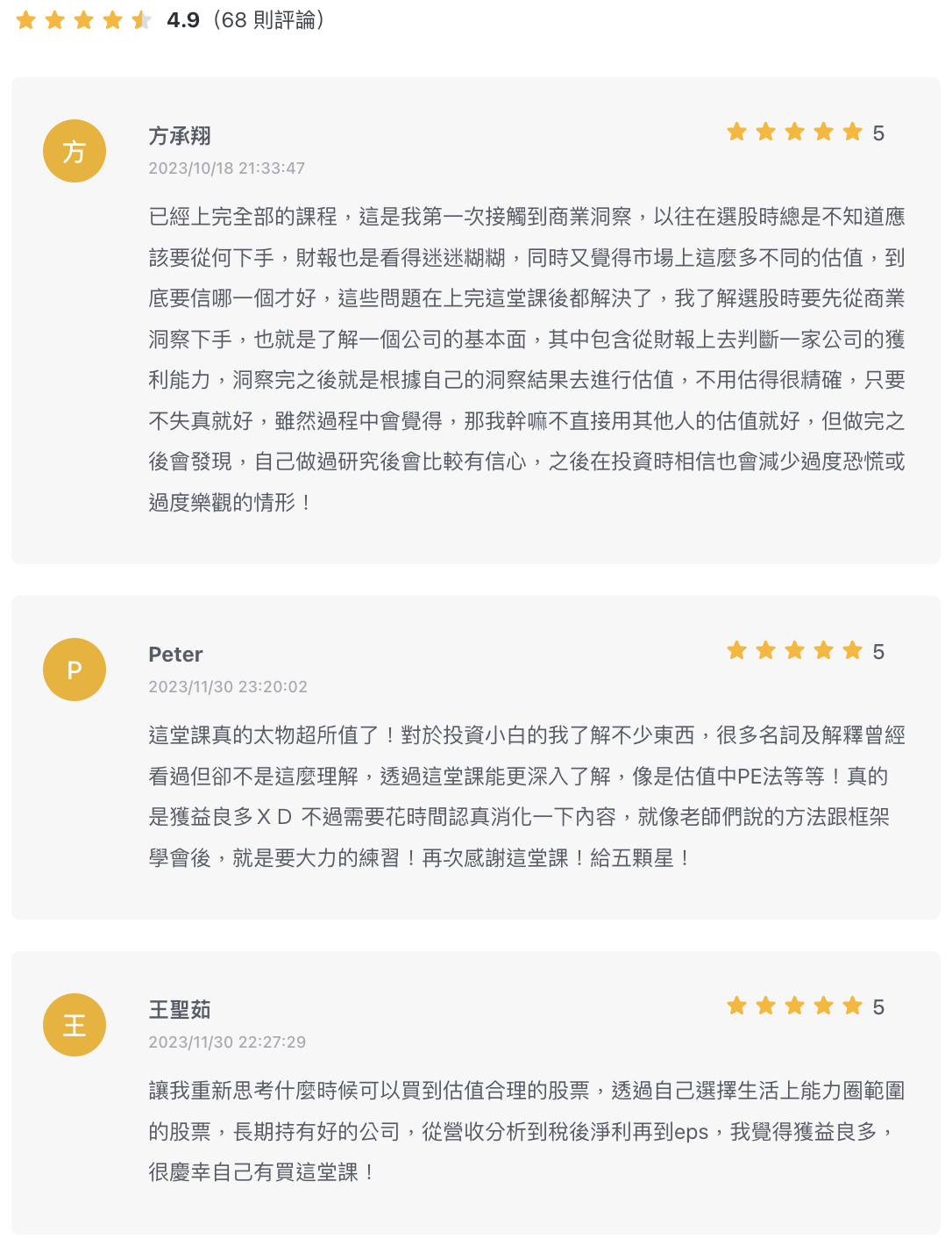 ❝ 覺得目前這門課最出色的地方,就是將「質化」的商業洞察,和「量化」的股價估計結合起來,並且提供了清楚的轉換方式。這是很多坊間課程、書都做不到的事情,感覺得出來富果在這點上投入心血 ❞ —— 廖同學