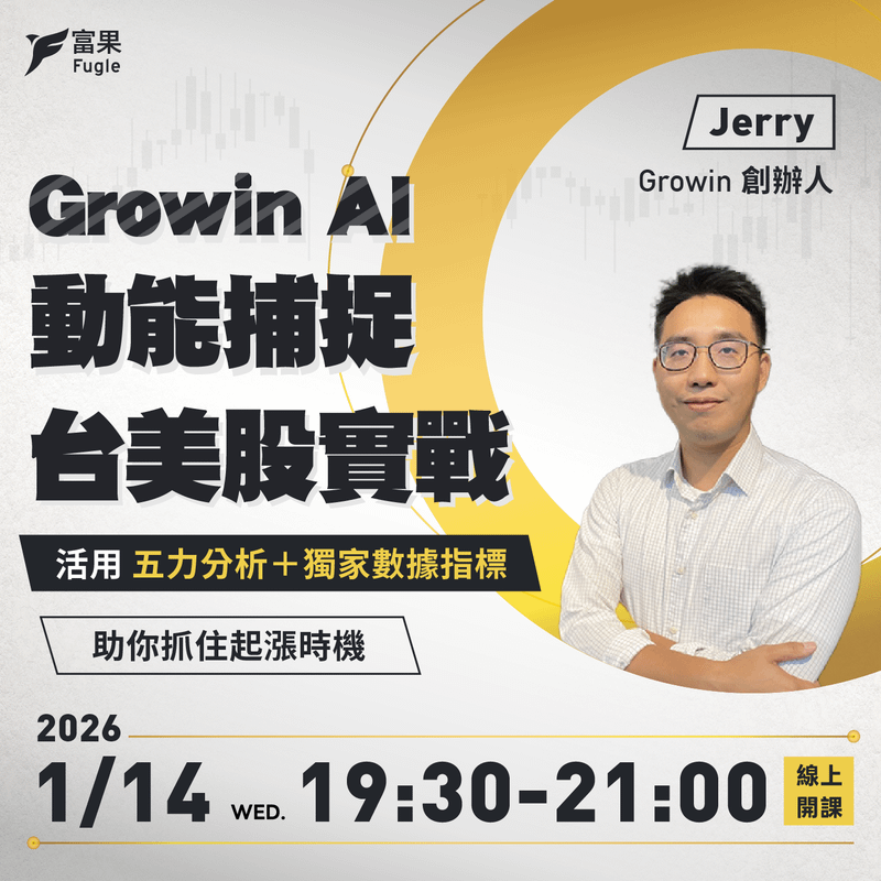 本場講座將帶你建立「AI 數據驅動」的核心決策思維: 當市場充滿雜訊,你需要的不是更多消息,而是更客觀的過濾機制。我們將結合 Growin 的 AI 量化模型與富果的實戰精神,教你用數據取代體感、用系統化過濾取代盲目猜測。在台美股雙市場中,一眼看穿誰才是真正具備「起漲動能」的潛力標的。